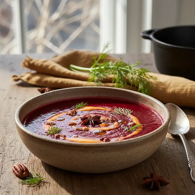 Ten aksamitny krem z pieczonych buraków to nowoczesna i elegancka interpretacja tradycyjnej zupy wigilijnej. Głęboki, rubinowy kolor zupy zachwyca od pierwszego spojrzenia, a jej smak jest prawdziwą symfonią doznań. Pieczenie buraków zamiast gotowania wydobywa z nich naturalną słodycz i ziemisty aromat, który jest doskonale zbalansowany przez świeżą, cytrusową nutę soku i skórki z pomarańczy. Dodatek anyżu gwiazdkowego wprowadza subtelny, korzenny posmak, przywodzący na myśl świąteczne ciepło. Zupa ma idealnie gładką, kremową konsystencję, która rozpływa się w ustach. Podana z kleksem gęstej śmietanki, chrupiącymi płatkami migdałów i odrobiną świeżego koperku, staje się nie tylko daniem, ale prawdziwą ozdobą wigilijnego stołu. To propozycja dla tych, którzy cenią tradycję, ale szukają w niej nowych, zaskakujących smaków.