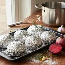 Każdego buraka z osobna zawiń szczelnie w kawałek folii aluminiowej. Ułóż zawinięte buraki na blasze do pieczenia. Wstaw blachę do nagrzanego piekarnika i piecz przez około 60-70 minut. Czas pieczenia zależy od wielkości buraków. Aby sprawdzić, czy są gotowe, ostrożnie rozchyl folię i wbij w buraka widelec lub szpikulec - powinien wchodzić z łatwością, bez oporu.