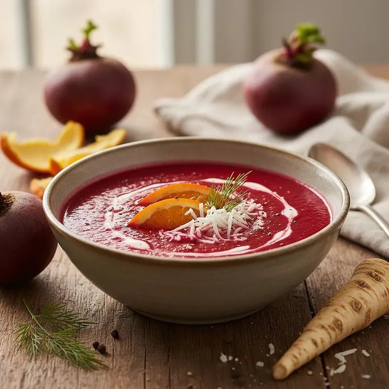 To nie jest zwykły barszcz! To elegancka i nowoczesna interpretacja wigilijnej zupy, która zachwyci gości swoim głębokim, rubinowym kolorem i aksamitną konsystencją. Sekretem niezwykłego smaku jest pieczenie buraków, co wydobywa z nich naturalną słodycz i ziemisty aromat, całkowicie odmieniając ich charakter. Dodatek świeżo wyciśniętego soku i skórki z pomarańczy wprowadza orzeźwiającą, cytrusową nutę, która doskonale równoważy słodycz buraków. Całość dopełnia odrobina ostrego chrzanu, dodająca zupie wyrazistości i świątecznego charakteru. Zupa jest idealna jako wykwintna przystawka na wigilijnym stole. Podana z chrupiącymi, domowymi grzankami o korzennym aromacie cynamonu i gałki muszkatołowej, staje się pełnoprawnym, rozgrzewającym daniem, które wprowadzi w magiczny, świąteczny nastrój.
