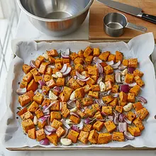 Wyłóż dużą blachę do pieczenia papierem. Rozłóż na niej pokrojoną dynię, cebulę i całe ząbki czosnku. Całość skrop dwiema łyżkami oliwy z oliwek (ok. 30g), posyp solą i pieprzem. Dokładnie wymieszaj dłońmi, aby każdy kawałek warzyw był pokryty oliwą i przyprawami.