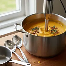 Zdejmij garnek z ognia. Za pomocą blendera ręcznego (żyrafy) zmiksuj zupę na idealnie gładki, aksamitny krem. Blenduj cierpliwie przez 2-3 minuty, poruszając blenderem po całym garnku, aby nie pozostały żadne grudki.