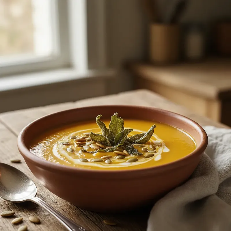Gorącą, kremową zupę rozlej do głębokich miseczek lub talerzy. Na wierzchu każdej porcji ułóż po 2-3 chrupiące chipsy z szałwii. Posyp obficie prażonymi pestkami dyni. Jeśli chcesz, możesz dodatkowo skropić zupę odrobiną oliwy z oliwek, oleju z pestek dyni lub kleksem mleczka kokosowego dla jeszcze lepszego efektu wizualnego. Podawaj natychmiast.
