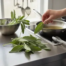 Teraz przygotuj chipsy z szałwii. Oderwij od gałązek około 12-16 największych listków szałwii i dokładnie je osusz papierowym ręcznikiem. Na tej samej małej patelni rozgrzej 2 łyżki oleju rzepakowego. Gdy olej będzie gorący (możesz wrzucić mały kawałek listka, aby sprawdzić – powinien od razu zacząć skwierczeć), ostrożnie wkładaj po kilka listków szałwii. Smaż je dosłownie przez 5-10 sekund z każdej strony, aż staną się chrupiące i lekko przezroczyste. Wyjmuj je łyżką cedzakową i odkładaj na talerz wyłożony ręcznikiem papierowym, aby odsączyć nadmiar tłuszczu. Posyp odrobiną soli.