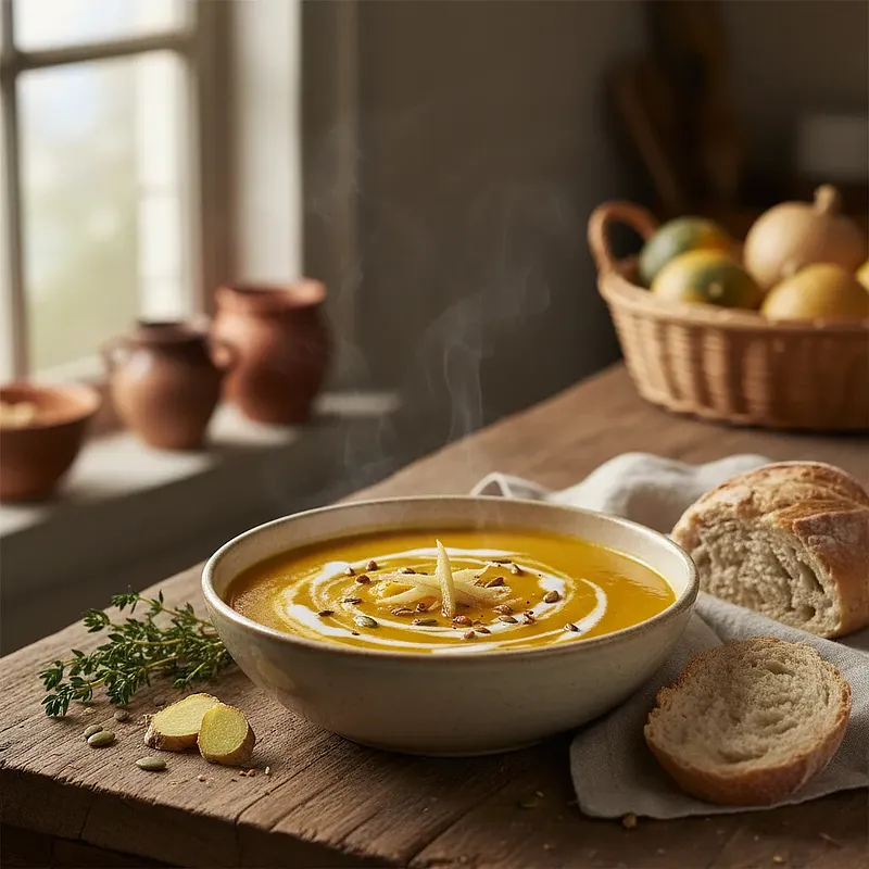 Oto kwintesencja jesieni zamknięta w misce. Ten aksamitny krem z pieczonej dyni to rozgrzewające, niezwykle aromatyczne i sycące danie, które zachwyca głębią smaku i intensywnym, pomarańczowym kolorem. Sekret jego wyjątkowości tkwi w pieczeniu dyni, co wydobywa jej naturalną słodycz i karmelowe nuty. Dodatek mleka kokosowego nadaje zupie egzotycznej kremowości i doskonale równoważy smak, podczas gdy świeży imbir i szczypta gałki muszkatołowej wprowadzają pikantną, korzenną nutę. Jest to danie idealne na chłodne dni, które można podać jako elegancką przystawkę na przyjęciu lub jako lekki, ale pełnowartościowy obiad. Serwowane z chrupiącymi pestkami dyni i świeżą kolendrą, staje się nie tylko ucztą dla podniebienia, ale i dla oczu.