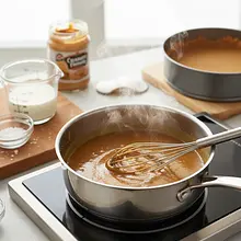 Gdy cały cukier się rozpuści i uzyska piękny, bursztynowy kolor, zdejmij rondelek z ognia. Ostrożnie dodaj 90g masła pokrojonego w kostkę. Mieszanina zacznie gwałtownie bulgotać i pryskać – zachowaj ostrożność. Mieszaj energicznie rózgą kuchenną, aż masło całkowicie się rozpuści i połączy z karmelem.
