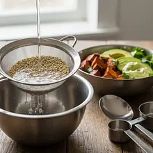 Po 15 minutach zdejmij garnek z ognia i pozostaw pod przykryciem na kolejne 5-10 minut. To pozwoli ziarnom 'dojść' i stać się idealnie puszystymi. Po tym czasie zdejmij pokrywkę i delikatnie 'wzrusz' komosę widelcem, aby rozdzielić ziarenka.