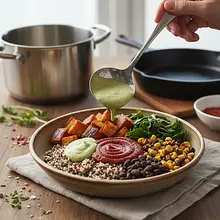 Czas na złożenie dania. Podziel ugotowaną komosę ryżową na dwie głębokie miski, tworząc bazę. Na wierzchu, w osobnych sekcjach, ułóż porcję upieczonych batatów, czarnej fasoli i kukurydzy. Staraj się, aby kolory były ładnie wyeksponowane obok siebie.