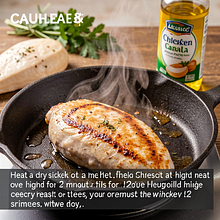 Rozgrzej suchą patelnię (lub z odrobiną oleju) na dużym ogniu przez 2 minuty — patelnia powinna być bardzo gorąca. Dodaj 10 g oleju rzepakowego (z puli) i ostrożnie połóż pierś z kurczaka. Smaż bez ruszania 3–4 minuty aż powstanie złocista, karmelizowana skórka. Obróć i smaż kolejne 3–4 minuty. Jeśli pierś jest gruba, włóż patelnię do nagrzanego piekarnika 180°C na 6–8 minut aby dopiec środek. Mięso jest gotowe gdy sok wypływający po nakłuciu jest klarowny i wnętrze nie jest różowe (alternatywnie temperatura wewnętrzna 74°C).