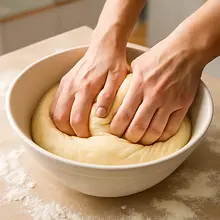 Przesiej mąkę do miski, dodaj resztę cukru, spienione drożdże, roztopione masło i jajka. Wyrabiaj ciasto przez około 10 minut, aż stanie się gładkie i elastyczne.