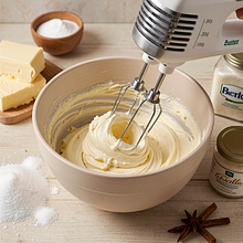 W osobnej dużej misce utrzyj miękkie masło z pozostałym cukrem (200 g) i cukrem wanilinowym na jasną, puszystą masę — miksuj 4–6 minut na średnich obrotach. Masa jest gotowa, gdy zmieni kolor na jasnokremowy i stanie się lekka oraz kremowa.