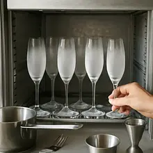 Upewnij się, że prosecco jest dobrze schłodzone (najlepiej 6–8°C). Najlepiej wstawić butelkę do lodówki 2–3 godziny wcześniej. Jeśli nie masz tyle czasu, włóż butelkę do wiaderka z lodem i wodą z dodatkiem garści soli na 20–30 minut — to przyspieszy chłodzenie.