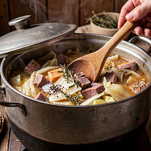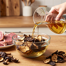 Przygotuj wszystkie składniki i naczynia. Wyjmij mięsa z lodówki na 30 minut przed gotowaniem (powinny być chłodne, nie lodowate). Namocz suszone grzyby w 200 ml ciepłej (nie gorącej) wody przez 30 minut: włóż grzyby do miski, zalej wodą o temperaturze około 40°C, przykryj talerzem. Po 30 minutach odcedź, zachowaj wodę z namaczania (odstaw), a grzyby pokrój na kawałki. Powtarzaj czynność spokojnie, nie przyspieszaj gorącą wodą — grzyby stracą aromat.