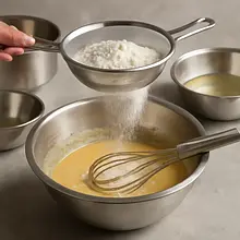 Wsyp przesianą mąkę z proszkiem do pieczenia i szczyptą soli do masy żółtkowej. Mieszaj od środka na zewnątrz delikatnymi ruchami szpatułki, aż nie będzie widać surowej mąki — krótkie, delikatne ruchy. Konsystencja powinna być gęstsza niż naleśnikowe ciasto, ale płynna. Jeśli wyda się zbyt gęste, dodaj pozostałe mleko po łyżce do osiągnięcia odpowiedniej konsystencji.