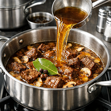 Grzyby suszone zalej około 200 ml gorącego, ale nie wrzącego bulionu wołowego w małej misce i odstaw na 20 minut do napęcznienia. Po 20 minutach przepuść płyn przez sitko wyłożone gazą lub drobnym sitkiem, oddzielając piasek — zachowaj płyn do sosu.