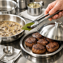 Tradycyjne polskie bitki wołowe w wersji z aromatycznym sosem grzybowym — mięso krojone z większego kawałka wołowiny, delikatnie rozbite, obsmażone i duszone w wywarze z suszonych grzybów i świeżych pieczarek. Danie ma korzenno-grzybowy charakter: głębia smaku pochodząca od suszonych borowików i wywaru wołowego, zaokrąglona śmietaną. Wygląda rustykalnie — kawałki mięsa w brązowym, gęstym sosie z widocznymi plasterkami grzybów i posiekaną pietruszką. Świetnie komponuje się z tłuczonymi ziemniakami, kluskami śląskimi, kaszą pęczak lub kaszą gryczaną. To danie sycące, rozgrzewające i idealne na rodzinny obiad w zimowe dni.