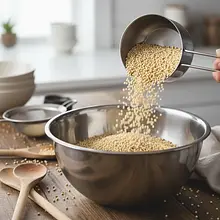 Zacznij od przygotowania kuskusu. Wsyp 100g kuskusu perłowego do średniej wielkości miski (najlepiej szklanej lub ceramicznej). Zagotuj w czajniku około 200 ml wody. Odmierz 150 ml wrzątku i zalej nim kuskus. Dodaj jedną szczyptę soli. Wymieszaj szybko łyżką, aby sól się rozpuściła, a woda równomiernie pokryła kuleczki. Przykryj miskę talerzykiem i odstaw na bok na około 10 minut. W tym czasie kuskus wchłonie całą wodę i stanie się miękki, ale wciąż sprężysty.