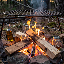 Przygotuj ognisko: rozpal drewno liściaste (dąb, buk, brzoza) i pozwól mu przejść w żar — to trwa około 20–30 minut od zapalenia. Celem są równomierne żarzące się węgle, a nie wysoki płomień. Jeśli używasz przenośnego grilla, nagrzej ruszt do średnio-wysokiej temperatury.