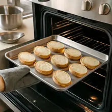 Wstaw blachę z kromkami do nagrzanego piekarnika i piecz przez 6–8 minut. Po 4 minutach obróć każdą kromkę na drugą stronę, aby zrumieniły się równomiernie. Kromki są gotowe, gdy brzegi stają się złote, a powierzchnia chrupiąca (powinna być sucha w dotyku). Jeśli używasz patelni, smaż 2–3 minuty na średnim ogniu aż pojawi się złota skórka.