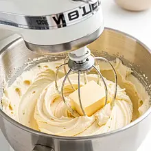Ubij masło (120 g wyjęte z całkowitej ilości) z 100 g cukru na puszystą, jasną masę: użyj miksera na średnich obrotach przez około 2–3 minuty. Masa powinna stać się jaśniejsza i kremowa. Następnie dodawaj po jednym jajku (120 g łącznie), miksując po każdym przez 20–30 sekund, żeby masa nie zwarzyła się.