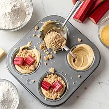 Napełnij papilotki do 2/3 wysokości przygotowanym ciastem — użyj gałkownicy do lodów lub dwóch łyżek, aby porcje były równe. Na wierzch każdej porcji połóż 2–3 kawałki macerowanego rabarbaru (odsącz nadmiar soku), tak aby kawałki nie były zatopione w cieście. Posyp każdą babeczkę przygotowaną kruszonką równomiernie.