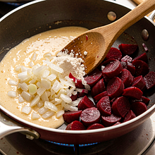 Spróbuj buraczków i dopraw do smaku. Jeśli chcesz dodać kwasowości, wlej ocet jabłkowy (opcjonalnie 1 łyżka) i szybko wymieszaj — od razu poczujesz żywszy smak. Dla kremowej wersji wlej śmietanę, mieszaj i podgrzewaj jeszcze 1–2 minuty, ale nie dopuszczaj do wrzenia. Śmietana sprawi, że sos będzie aksamitny i łagodniejszy.