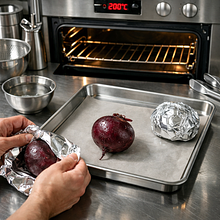 Nagrzej piekarnik do 200°C (góra-dół). Umyj buraka, owiń w folię aluminiową lub położ na blasze i piecz 45-60 minut aż będzie miękki - sprawdzisz to wbijając ostry nóż: nóż powinien wejść prawie bez oporu. Po upieczeniu ostudź przez 10 minut, obierz skórkę (zejdzie łatwiej po ostudzeniu) i pokrój na kawałki. Włóż upieczonego buraka i majonez do wysokiego naczynia i zmiksuj blenderem na gładki, intensywnie różowy sos. Dopraw 1 szczyptą soli (1g) i 1 szczyptą pieprzu (1g). Spróbuj i ewentualnie dopraw jeszcze lekką łyżeczką soku z ogórka kiszonego, jeśli lubisz.