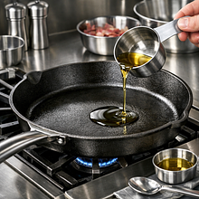 Rozgrzej patelnię żeliwną na średnio-wysokim ogniu. Dodaj 15 g oleju rzepakowego (1 łyżka). Gdy olej zacznie lekko migotać, połóż kotlety. Smaż 3-4 minuty z jednej strony bez poruszania — powinien wytworzyć się dobrze przyrumieniony brązowy spód. Obróć kotlety i smaż kolejne 3-4 minuty na drugiej stronie dla stopnia wysmażenia medium (wewnętrzna temperatura ok. 65°C). Jeśli chcesz medium-well, smaż 4-5 minut na stronę. W ostatniej minucie połóż na kotletach plastry sera (opcjonalnie), przykryj patelnię pokrywką lub odstaw na chwilę, aby ser delikatnie się rozpuścił.