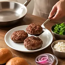 Przełóż gotowe burgery na talerz i odstaw na 5 minut, aby odpoczęły. Serwuj z ulubionymi dodatkami.