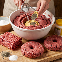 Do dużej miski włóż wołowinę mieloną, dodaj 4 g soli i 2 g pieprzu (równomiernie), 15 g musztardy i delikatnie wymieszaj dłońmi przez 20-30 sekund — wystarczy, by przyprawy się połączyły. Podziel mięso na 4 równe porcje po 200 g. Uformuj kotlety o grubości ok. 2 cm, robiąc lekki spłaszczenie na środku kciukiem (zapobiegnie kurczeniu się mięsa podczas smażenia).