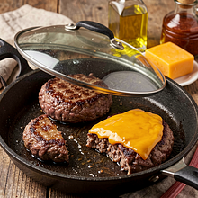 Rozgrzej patelnię żeliwną lub grill do wysokiej temperatury. Jeśli używasz patelni, dodaj 1 łyżkę oleju rzepakowego (15 g). Połóż kotlety i smaż bez ruszania przez 3-4 minuty na stronie pierwszej (zależy od grubości) aż na powierzchni pojawi się ładna brązowa skórka. Obróć kotlety i smaż kolejne 3-4 minuty. Na ostatnie 1,5-2 minuty połóż na każdym kotlecie plastry sera cheddar, przykryj pokrywką, aby ser się roztopił. Kotlety gotowe, gdy temperatura wewnętrzna osiągnie ok. 70°C (bezpieczeństwo mięsa mielonego) lub gdy sok będzie jasny, a mięso nie surowe w środku.