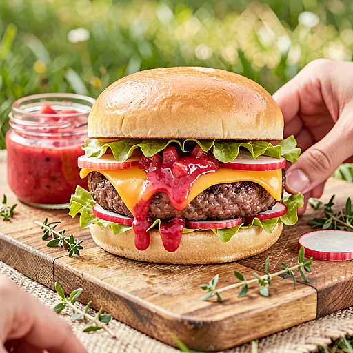Soczyste burgery z mielonej wołowiny z roztopionym plastrami sera cheddar i orzeźwiającym, lekko kwaskowatym chutney z rabarbaru. To majówkowy twist na klasyczny burger — rabarbar dodaje wiosennej świeżości i kwasu, który pięknie równoważy tłustość mięsa i sera. Podawaj na lekko podpieczonych bułkach z sałatą masłową, rzodkiewką i musztardą. Idealne na grill, piknik lub rodzinny obiad na świeżym powietrzu — wygląda efektownie, a smaki są zbalansowane: słodko-kwaśny chutney, słony cheddar i pikantna musztarda.