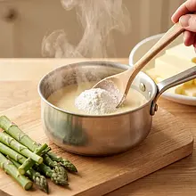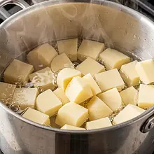 Umyj ziemniaki i pokrój na podobnej wielkości kawałki (ok. 2-3 cm). Włóż do garnka i zalej zimną wodą tak, aby woda przykryła ziemniaki na 2 cm. Dodaj 1 łyżeczkę soli (ok. 5 g). Doprowadź do wrzenia na dużym ogniu, zmniejsz ogień i gotuj 15-20 minut, aż ziemniaki będą miękkie – sprawdzisz to widelcem: widelec powinien wchodzić w ziemniak gładko, bez oporu.