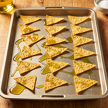 Włóż blachę do piekarnika i piecz 8-12 minut. Po około 6 minutach otwórz piekarnik i sprawdź dolne kawałki — jeśli są złoto-brązowe, obróć pojedynczo trójkąty szpatułką, aby równomiernie się przyrumieniły. Chipsy są gotowe, gdy brzegi są złote i chrupiące, ale nie przypalone.