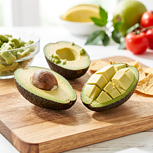Przygotuj składniki do guacamole: przekrój awokado na pół wzdłuż, obróć połówki i wyjmij pestkę. Ostrym nożem nacinaj miąższ w kratkę nie naruszając skórki, a następnie łyżką wyjmij pokrojone kawałki do średniej miski.