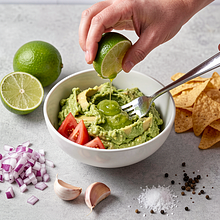 Podawaj chipsy w koszyku wyłożonym lnianą ściereczką, a guacamole w niewielkiej miseczce z kilkoma plasterkami limonki. Uzupełnij talerz o warzywne paski (marchew, ogórek) i ser żółty pokrojony w kostkę dla urozmaicenia.