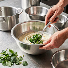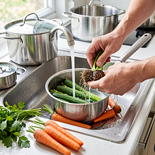 Umyj wszystkie warzywa pod bieżącą zimną wodą, usuwając ziemię i korzenie. Obierz marchew, pietruszkę, seler i buraka cienką warstwą skórki przy pomocy obieraczki do warzyw. Młode ziemniaki możesz zostawić ze skórką jeśli są gładkie. Na desce do krojenia użyj mandoliny ustawionej na 1–2 mm lub bardzo ostrego noża: kroj plastry równomiernie, trzymając warzywo z dłonią ułożoną „pazurkiem” (palce zgięte do środka) dla bezpieczeństwa. Celem są cienkie, przezroczyste plastry — łatwo rozpoznasz odpowiednią grubość, gdy brzeg plastra zaczyna być półprzezroczysty i giętki.