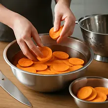 Umieść wszystkie plasterki w dużej misce z zimną wodą i mocz przez 20–30 minut. Ten zabieg wypłukuje nadmiar skrobi powierzchniowej, co znacząco pomaga uzyskać chrupkość. Po namaczaniu odcedź plasterki przez durszlak, a następnie osusz bardzo dokładnie warstwami na kuchennych ręcznikach papierowych lub użyj wirówki do sałaty — plasterki powinny być suche w dotyku, bez widocznych kropli wody.