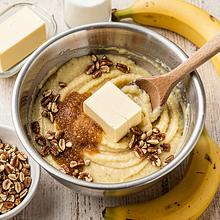 Do rozgniecionych bananów dodaj miękkie masło oraz cukier brązowy i cukier waniliowy. Użyj miksera na niskich obrotach lub drewnianej łyżki i wymieszaj do połączenia — masa powinna być gładka, kremowa i jednolita.