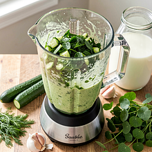 Do blendera kielichowego włóż pokrojone ogórki (600 g), posiekany szczaw (120 g), połowę posiekanego koperku (pozostały do dekoracji), ząbek czosnku (5 g) oraz 300 ml maślanki z miski. Miksuj na średnich obrotach pulsem przez 30-45 sekund, aż warzywa będą rozdrobnione, ale z zachowaniem lekkiej struktury (nie na idealnie gładkie puree).