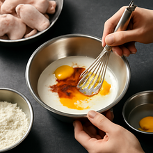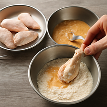 Przygotuj trzy naczynia obok siebie: 1) czysty talerz do odłożenia surowych skrzydełek, 2) miska z mokrą marynatą (ta, w której marynowałeś), 3) miska z suchą mieszanką. Wyjmuj skrzydełka pojedynczo: najpierw obtocz w suchej mieszance (lekko dociskając, aby mąka przyległa), następnie zanurz w mokrej marynacie (obracaj, by każda część była pokryta), a na koniec ponownie obtocz w suchej mieszance — to tzw. podwójne panierowanie, które daje najbardziej chrupiącą powłokę. Po obtoczeniu odkładaj skrzydełka na kratkę lub talerz, nie układaj jedno na drugim.