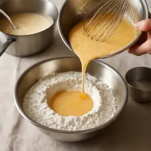 W osobnej miseczce roztrzep jajka z ekstraktem waniliowym. Najpierw wlej do zagłębienia w mące połowę piwa (pokojowa temperatura) i stopniowo dodawaj roztrzepane jajka. Mieszaj widełkami tylko środkową część, aż składniki się połączą; jeśli ciasto jest zbyt suche, dolewaj resztę piwa po 10–15 ml, aż wilgoć będzie wystarczająca do zlepienia ciasta.