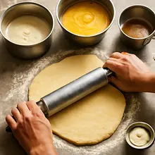 Przygotuj wszystkie składniki i narzędzia: wagę kuchenną, dużą miskę, stolnicę lub czystą powierzchnię do wyrabiania, nóż do krojenia masła, wałek, folię spożywczą. Wyjmij masło i jajka, aby masło zmiękło przez 20–30 minut. Odmierz mąkę i przesiej ją do dużej miski, aby napowietrzyć (przesiewanie zapobiega grudkom).