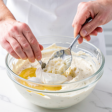 Obierz korzeń chrzanu cienko nożem (usuń zdrewniałe końcówki). Zetrzyj chrzan na drobnej tarce lub użyj malaksera do uzyskania bardzo drobnej konsystencji. Jeśli nie lubisz bardzo ostrego smaku, zetrzyj mniej, a resztę zostaw do doprawienia. Po starciu chrzanu natychmiast przejdź do mieszania — jego aromat jest najsilniejszy zaraz po starciu.