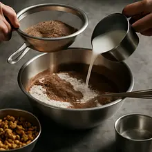 Do miski z mokrymi składnikami dodawaj na przemian przesiane suche składniki i mleko: najpierw 1/3 suchych składników, wymieszaj delikatnie szpatułką lub mikserem na najniższych obrotach przez ~15 sekund, potem 1/2 mleka, potem znów sucha część — powtarzaj, kończąc suchymi składnikami. Mieszaj tylko do połączenia; masa powinna być gładka i lekko gęsta, nie przesadzaj z miksowaniem.