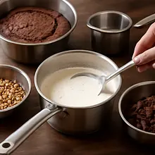 Przygotuj polewę: w małym rondelku podgrzej śmietankę prawie do wrzenia (małe bąbelki przy brzegach), nie dopuszczając do wrzenia. Zdejmij z ognia, wsyp posiekaną czekoladę (zachowując część do dekoracji) i odczekaj 1 minutę, następnie mieszaj równymi, powolnymi ruchami od środka na zewnątrz, aż powstanie gładka, lśniąca masa. Odstaw na 10–15 minut, aż lekko zgęstnieje do konsystencji nadającej się do rozprowadzania.