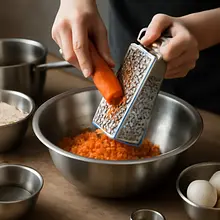 Zetrzyj marchew na tarce o drobnych oczkach bezpośrednio do dużej miski. Gdy marchew jest starta, odciśnij nadmiar bardzo płynnej soku (jeśli marchew jest bardzo soczysta) przy pomocy ściereczki kuchennej — jednak pozostaw wilgoć, która nada ciastu miękkość.