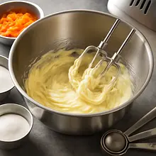 Dodaj mokre składniki (startą marchew) do miski z ubitymi jajkami i delikatnie wymieszaj drewnianą łyżką lub szpatułką. Następnie dodawaj suche składniki porcjami: najpierw 1/3 suchych składników, wymieszaj delikatnie tylko do połączenia, potem kolejną 1/3 i na końcu resztę. Mieszaj do momentu, aż nie będzie suchych smug mąki — nie mieszaj za długo, by ciasto nie stało się twarde.