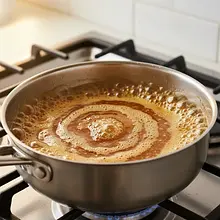 W średniej wielkości rondelku z grubym dnem umieść 100g masła, 150g cukru i 80ml wody. Podgrzewaj na średniej mocy palnika, mieszając od czasu do czasu drewnianą łyżką, aż masło i cukier całkowicie się rozpuszczą. Następnie zwiększ moc i doprowadź syrop do wrzenia. Gotuj przez około 4-5 minut bez mieszania, aż syrop lekko zgęstnieje.