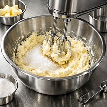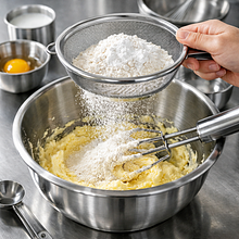 W osobnej misce przesiać mąkę z proszkiem do pieczenia i solą. Dodaj suche składniki do masy maślanej w trzech porcjach, mieszając łopatką lub mikserem na najniższych obrotach tylko do połączenia (około 15-20 sekund każdorazowo). Nie miksuj nadmiernie — celem jest delikatne połączenie składników.