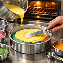 Lekki biszkopt waniliowy przekładany sześcioma kolorowymi warstwami kremu na bazie twarogu i śmietanki — każda warstwa zabarwiona naturalnymi polskimi składnikami: burakiem, marchewką, kurkumą, szpinakiem, jagodami i mieszanką na fiołkowy odcień. To nowoczesna reinterpretacja klasycznego ‚rainbow cake’: zamiast piec wielu osobnych kolorowych blatów, pieczemy jeden delikatny biszkopt i między jego cienkie plastry nakładamy krem w intensywnych, ale naturalnych kolorach. Ciasto jest efektowne wizualnie, łagodne w smaku (bez chemicznych barwników jeśli nie chcesz) i świetne jako deser na urodziny, przyjęcie czy popołudniową kawę. Dzięki użyciu twarogu kremowego krem jest lekko kwaskowaty i stabilny, a dodatek śmietanki daje puszystą strukturę. Porcja dla 4 osób — mały okrągły tort (średnica około 18 cm).
